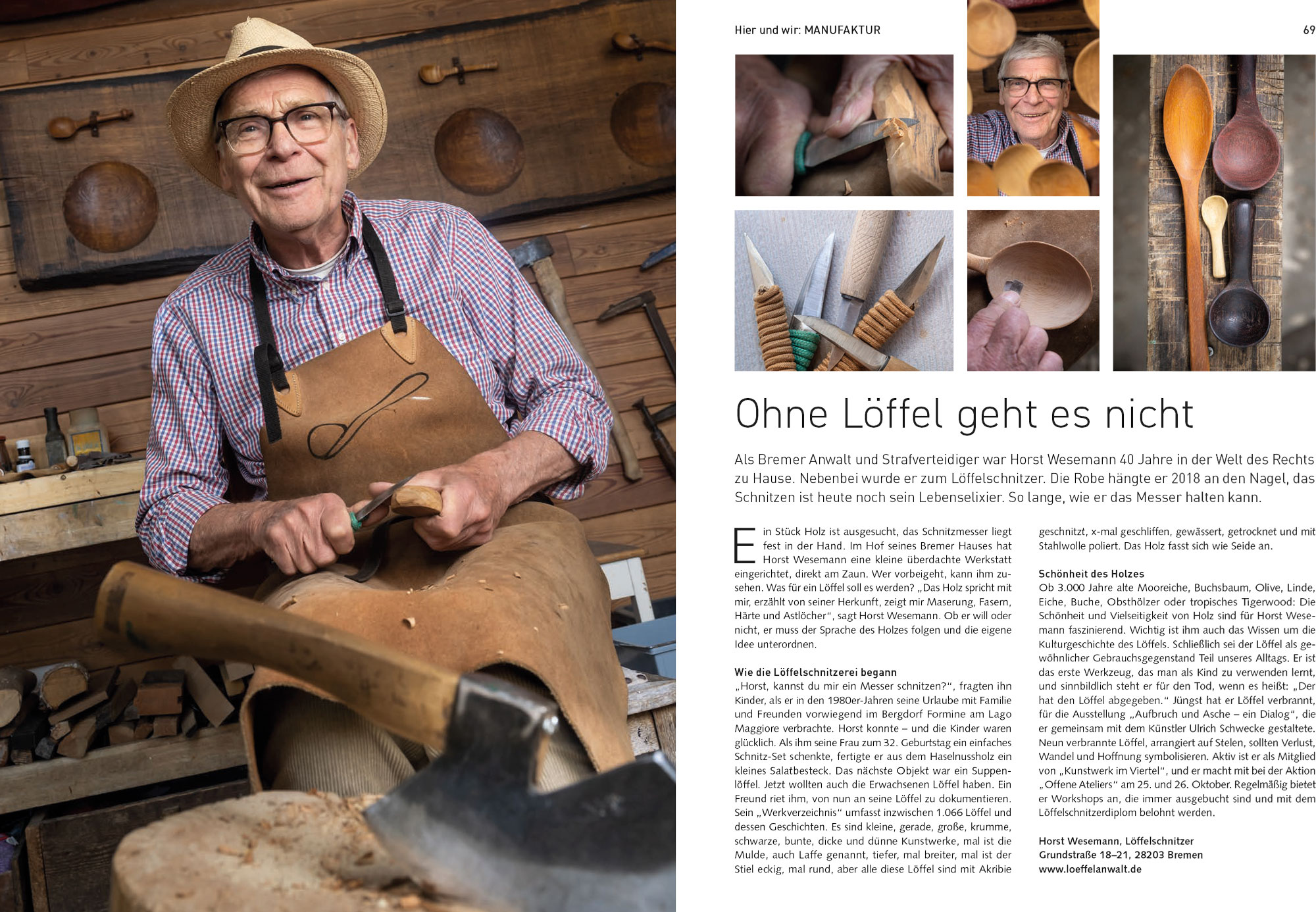 „Bis 2018 war Horst Wesemann Strafverteidiger. Er betreute RAF-Terroristin Adelheid Schulz in der Haft und vertrat den Angeklagten im Mordfall Jutta Fuchs, bekannt als „Mord ohne Leiche“. Einen Ausgleich zu dieser fordernden Tätigkeit fand der Bremer vor 35 Jahren in einem kleinen Bergdorf in Italien. Seitdem schnitzt er kunstvolle Holzlöffel. Bis Mitte April stellt er zusammen mit dem Künstler Ulrich Schwecke im Kapitel 8 in der Ausstellung „Asche & Aufbruch – Ein Dialog“ aus.“
